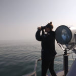Distance sampling mostly consists of me scanning the horizon with special binoculars and shouting information back to our designated data recorder. Photo by: Delphine Durette-Morin/NEAq/CWI