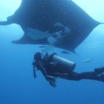 Una manta gigante en Islas Catalinas nadando sobre nuestras burbujas. Créditos Andrés Berrocal