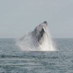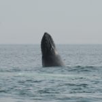 Soon afterwards, we came upon a group of three logging (resting at the surface) humpback whales, who we identified as Partition, Ridgeline, and Squiggle. As we watched, a fourth interloper came along, known as Blanco, and startled them awake, causing the sleepy trio to breach simultaneously! Amy K. caught it on video- check it out!