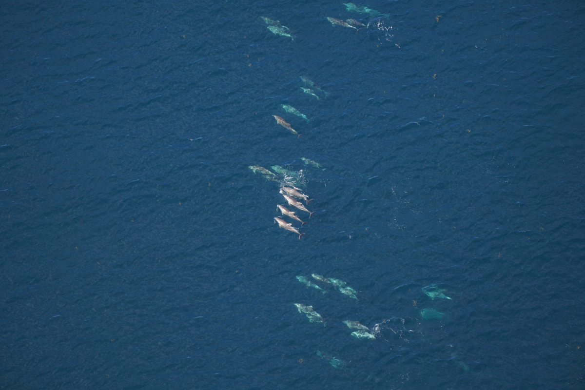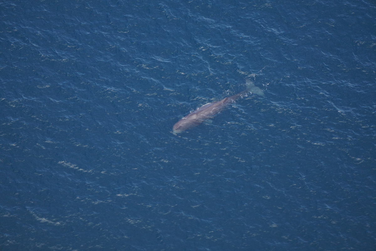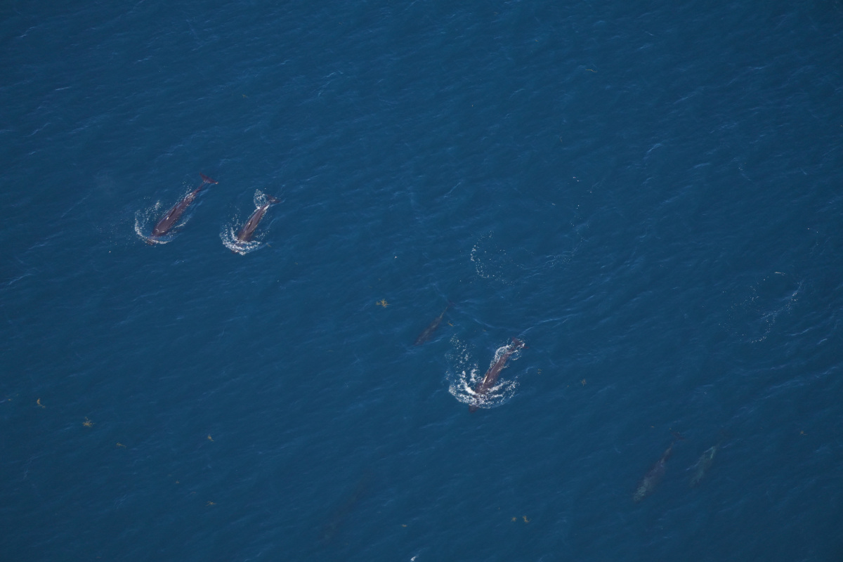 The waters were dotted with small groups of dolphins, and we regularly diverted from our track lines to fly over these groups and photograph them. Some of these species, like the Risso’s dolphins and pilot whales, eat squid similar to the larger beaked and sperm whales. But other species we saw, like bottlenose, striped, and common dolphins, extend their diet beyond squid to include small fish or other food items. And less than five miles away from the squid-specialist sperm whales, we saw a fin whale, which eats primarily small fish. In between all the dolphin sightings, we saw ocean sunfish–which eat jellyfish–and basking sharks, which filter feed on plankton. The Monument is special in this way: it brings together large numbers of species to feed, both above and below the surface.