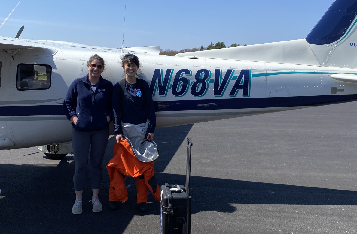 Observers Orla O’Brien (left) and Sharon Hsu (right) stand in front of the survey plane with all the survey equipment.