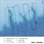 The Northeast Canyons did not let me down! Most of the species we saw were new to me: we photographed striped (Stenella coeruleoalba), bottlenose (Tursiops truncatus), and common dolphins (Delphinus delphis), plus pilot (Globicephala sp.), True’s beaked (Mesoplodon mirus), and sperm whales! All of these whales and dolphins are odontocetes, or toothed whales, as opposed to mysticetes, or baleen whales. In general, toothed whales seem to have a stronger and less seasonally variable association with canyon habitats than baleen whales, which might explain why we don’t see baleen whales on every flight here.