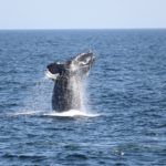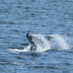 In the second half of the cruise, we logged over five days at sea–even though conditions continued to be rough. On the final day offshore, we found seven right whales near an area off of Prince Edward Island that’s closed to fishing. To our knowledge, no right whales have ever been sighted in this closed area–so it was exciting to see them here! We also spotted three mother-calf pairs during the cruise: “Silt” (Catalog #1817), “Slalom” (Catalog #1245), and Catalog #4180. Silt’s calf put on a show for everyone at sunset, breaching numerous times.