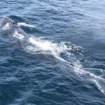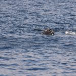 It is not uncommon for us to see adult males head pushing and making loud, percussive underwater noises (called “gunshots”) far from other whales. We found “Scarf” (Catalog #1429), a 40-year-old male, far from other whales and behaving oddly by sinking and coming close to the boat. No head pushing or “gunshots,” but he may well have done so at the end of the day after we left the area. We saw him again the next day when he joined a surface-active group (SAG) with Catalog #3720, a 15-year-old female, and another individual. Scarf has bright white scars on his head which make him easy to pick out of a crowd.