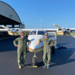 Orla and Katherine stand in front of the plane, while co-pilot Wayne smiles from inside.