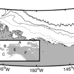 Study area with Alaska shown in grey. Inset shows the larger region including our study area (hatched), the Beaufort (A), Chukchi (B) and Bering (C) seas, and Russia (D), Alaska USA (E) and Canada (F). Bathymetric contours at -20, -50, -200, -2000 meters are shown from light to dark. Point Barrow is the northernmost point of land.