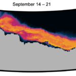 Modeled average bowhead whale habitat suitability from 1988 – 2012 for the week September 14 –21. The prediction was produced using bathymetry and modelled ocean conditions including zooplankton prey, sea ice, temperature and flagellates. Per the color bar at right, warmer colors indicate higher habitat suitability and cooler colors indicate lower habitat suitability. Gray is the land of Alaska, USA. Geographic boundaries of the plot are 140 – 160 °W and 69 – 72 °N.