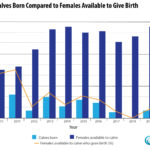 Number of calves born (light blue) compared to known reproductive females available to calve (dark blue). The orange line is the percentage of females available to calve that gave birth from 2009 to 2020. Data from the 2020 NARWC Report Card.