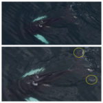 When we are able to photograph the underside of the fluke on our aerial surveys, we send photos to the Humpback Whale Studies Program at the Center for Coastal Studies to identify the individuals based on their unique features. In late June we photographed a bubble-feeding aggregation that had two well-known Gulf of Maine humpbacks that are actually sisters: Thalassa and Mostaza!