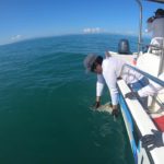Una vez capturado, el tiburón es subido a bordo con una herramienta parecida a un cazamariposas con un tamaño mayor de red para reducir el estrés en la manipulación del animal. Luego, nuestro querido tiburón es sujetado firme pero cuidadosamente y oxigenado en el mar. Luego es puesto en un área acondicionada para la toma de medidas, fijación de marcas numeradas (para una posible recaptura) e implantación de la etiqueta acústica, siempre considerando el estado de actividad del tiburón, y siendo liberado si es necesario, pues el escualo debe volver en buen estado al mar. Así, Claudia y yo aprendimos tanto en gabinete y en el mar sobre telemetria de tiburones y muestreamos nuestros primeros tiburones bajo la supervisión de dos grandes investigadores, y de paso tuvimos espectaculares amaneceres y fuimos cobijados por infinitos cielos estrellados, todo esto, mientras estábamos a bordo del bote de Misión Tiburón.